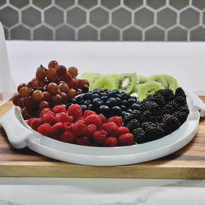 Perfect for cakes, cupcakes and pies! Clear dome shows off desserts, cupcake disc holds 11 cupcakes. Sturdy handle for transport. BPA-free. Polypropylene. Dishwasher and refrigerator safe. 11.5"Diam. x 6"H.